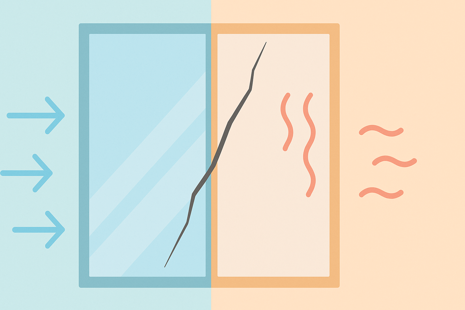 ガラスの熱割れとは、温度差によってガラスが膨張・収縮し、内部に応力が発生して割れてしまう現象です。たとえば、外気温が低い冬に暖房で室内が暖かくなると、ガラスの内側と外側で大きな温度差が生まれます。その結果、ガラス内部に負担がかかり、直線的なヒビが突然走るのです。