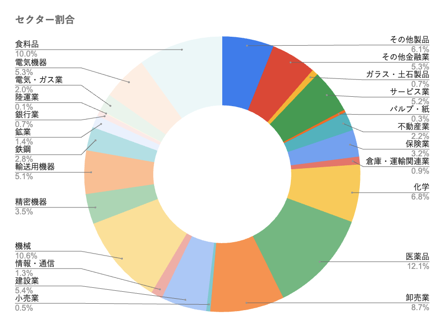 そこで、取得した株式をセクター(業界)別に区分けして、常に各セクター比率を分散できているかチェックする必要があります。