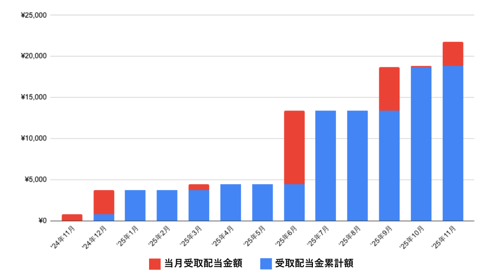 2024年12月〜2025年11月の1年間で受け取った配当金は 21,803円。
