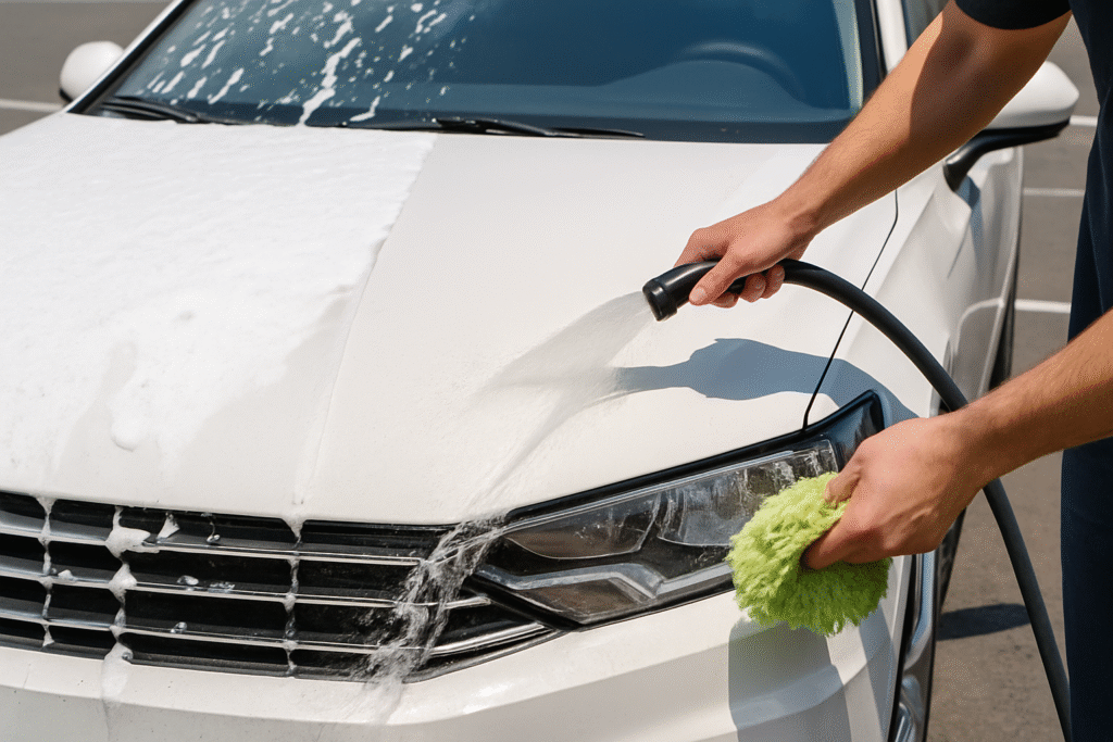 - 手順:1)予洗い → 2) 希釈液でフォーム → 3) ミットで手洗い → 4) パネル分割すすぎ → 5) 拭き上げ