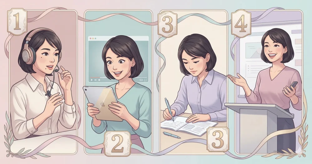 彼女が最も重視しているのがシャドーイングです。 「聞こえてくる音を、0.5秒遅れでそのまま口に出す」。これを1日も欠かさず行いました。単に繰り返すのではなく、**「イントネーションや感情までコピーする」**のが森迫流。これにより、ネイティブ特有の「音の繋がり」を脳に叩き込みました。